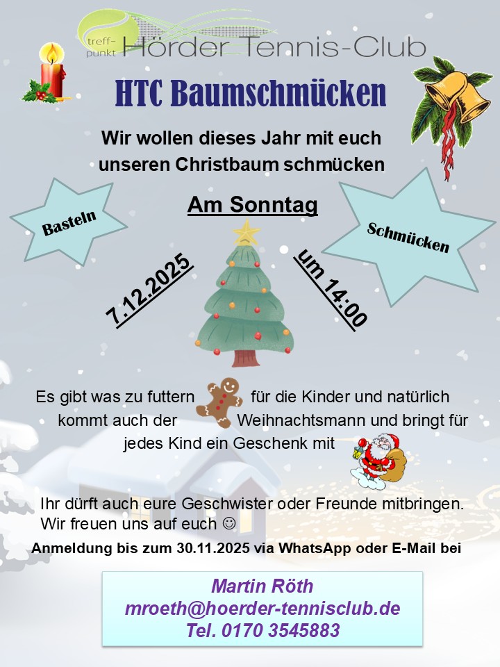 Unser beliebtes HTC Baumschmücken geht dieses Jahr bereits in die dritte Runde. Am 7. Dezember um 14 Uhr findet wieder unser HTC Baumschmücken statt. Wie immer ist viel Spaß für die Kinder garantiert. Alle Kinder sind eingeladen mitzumachen. Am Ende kommt der Weihnachtsmann und bringt für jedes Kind ein Geschenk mit.